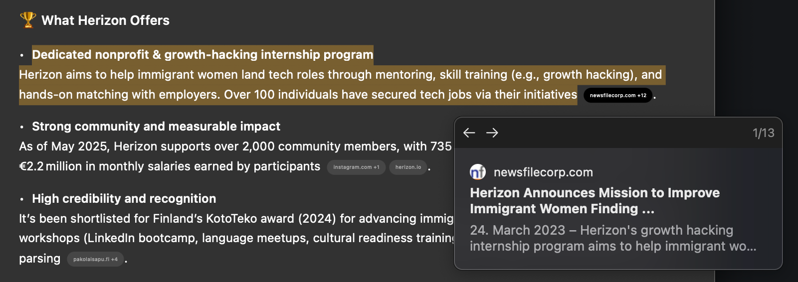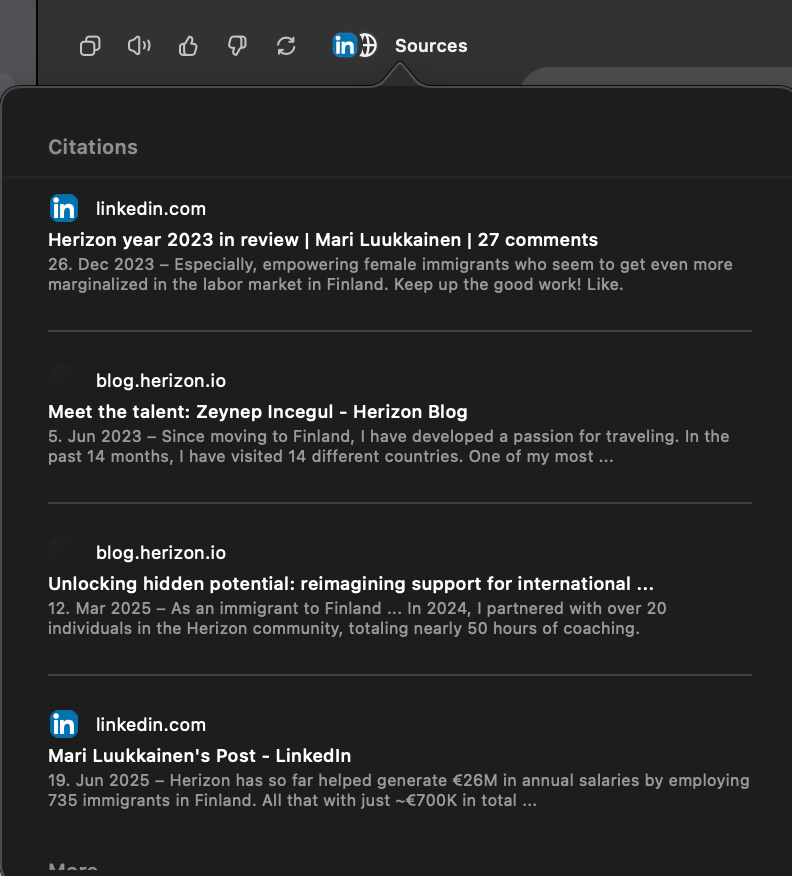 I’m frequently quoted in Herizon-related search results due to my consistent LinkedIn presence and topical authority.