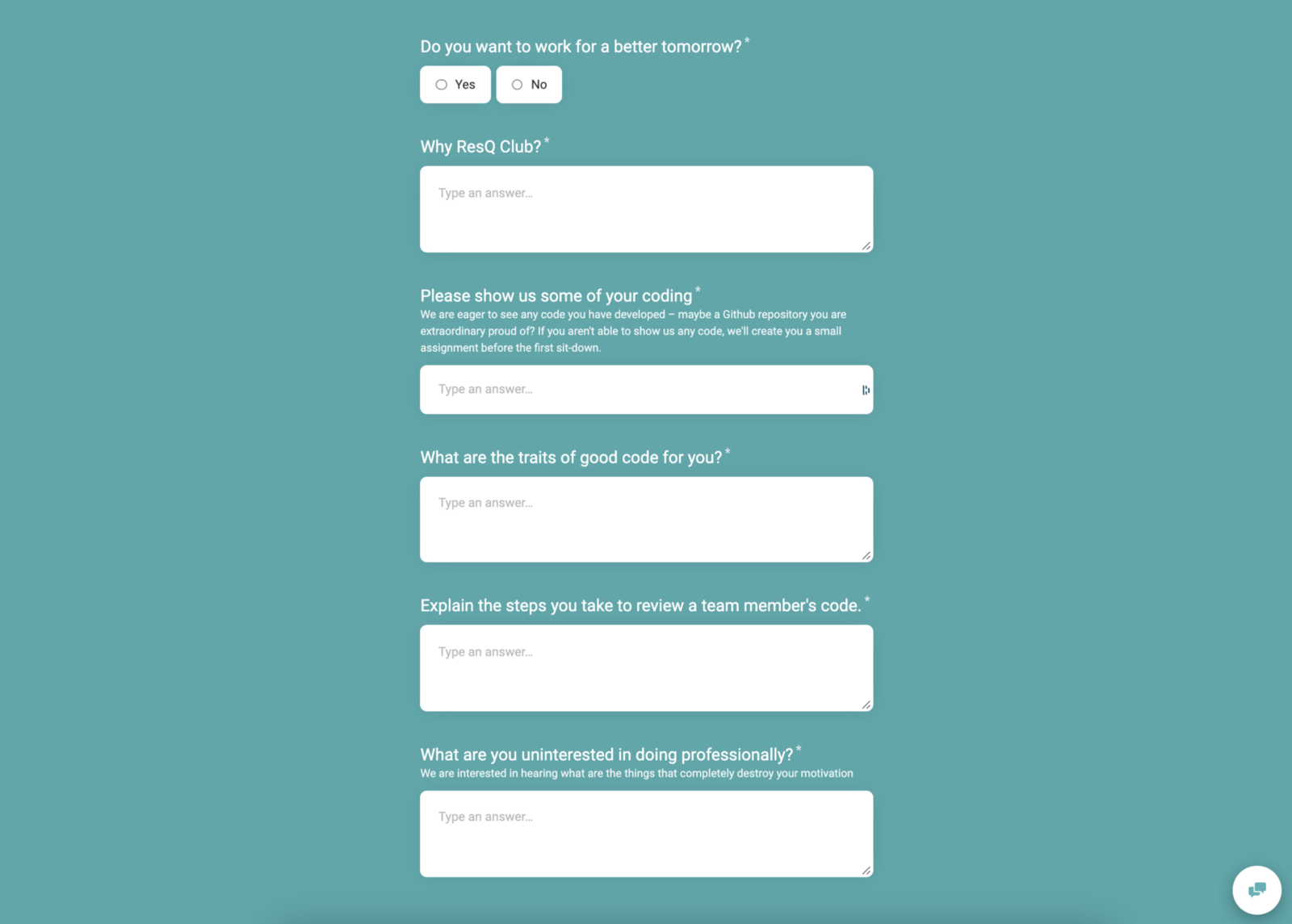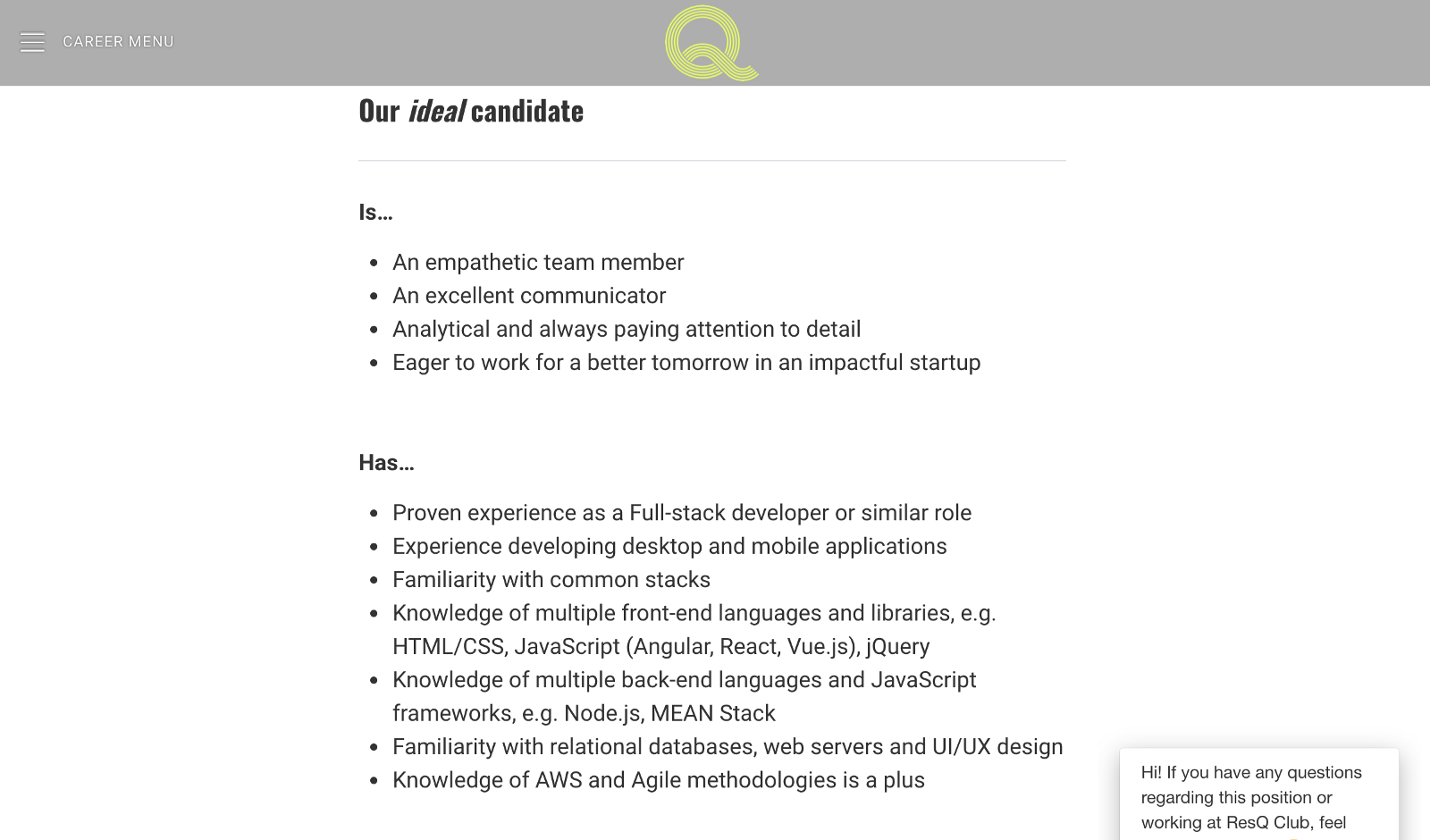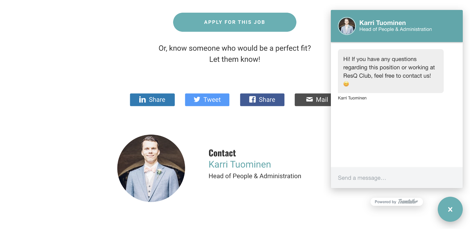 ResQ Club’s Teamtailor chat for applicants.