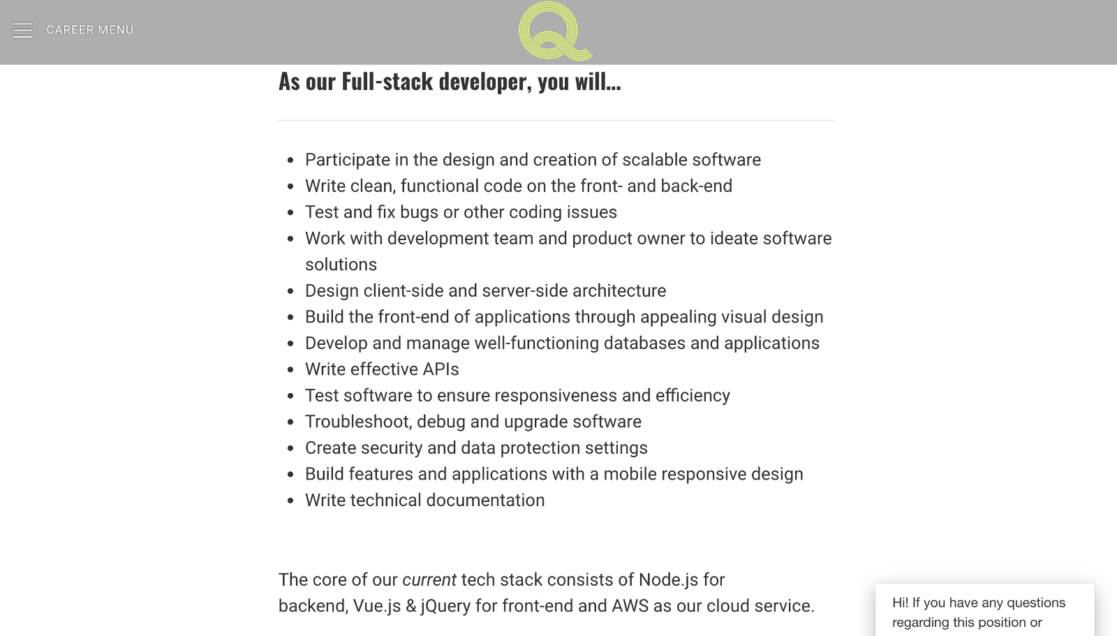 If your company does not obviously operate within the technology industry, detailing your tech stack might give you the edge over a tech company. At the same time, being specific about the technology your company uses helps weed out unsuitable candidates. Those without experience with specific tools will either not apply or have an idea of areas in which they may need to broaden their qualifications.