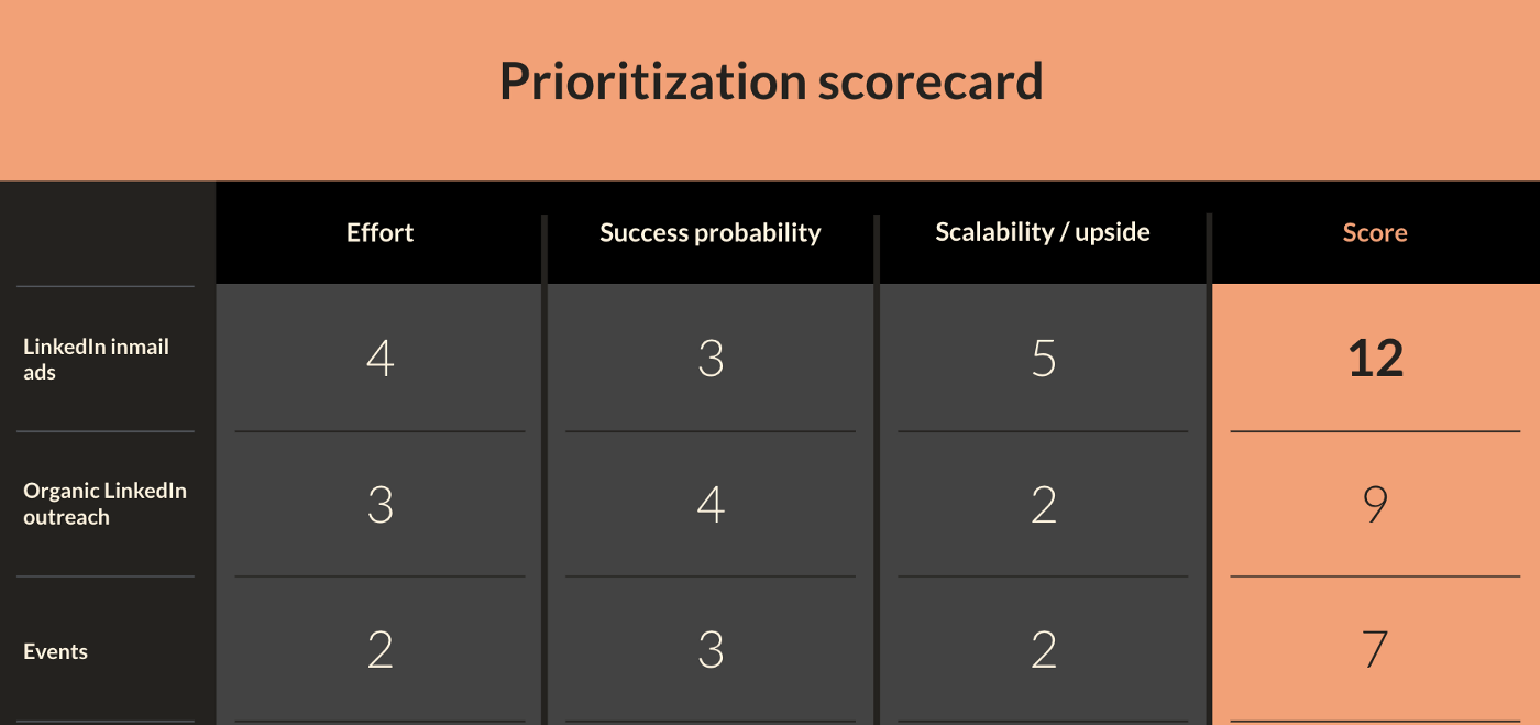There are several strategies to prioritize your ideas quantitatively. Generally, there are two types of scorecards: one-dimensional and two-dimensional scorecards. A one-dimensional score card aggregates scores for three metrics: effort (low effort is obviously better), success probability, and scalability / upside. Take a look at how a 1-dimensional scorecard for lead magnet sign-ups would look like for Company X.